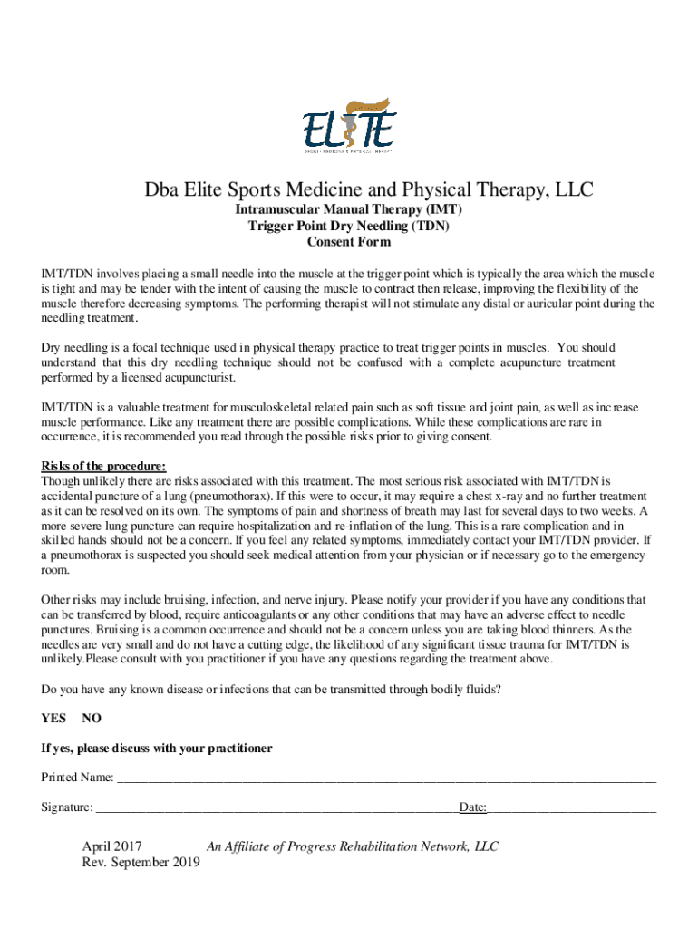 DBA Elite Sports Medicine and Physical Therapy, LLC Intramuscular Manual Therapy (IMT) Trigger Point Dry Needling (TEN) Consent Form IMT/TEN involves placing a small needle into the muscle at the