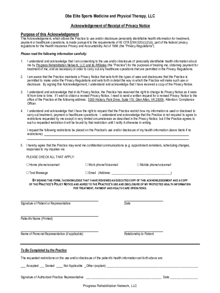 DBA Elite Sports Medicine and Physical Therapy, LLC Acknowledgement of Receipt of Privacy Notice Purpose of this Acknowledgements Acknowledgement, which allows the Practice to use and/or disclosure
