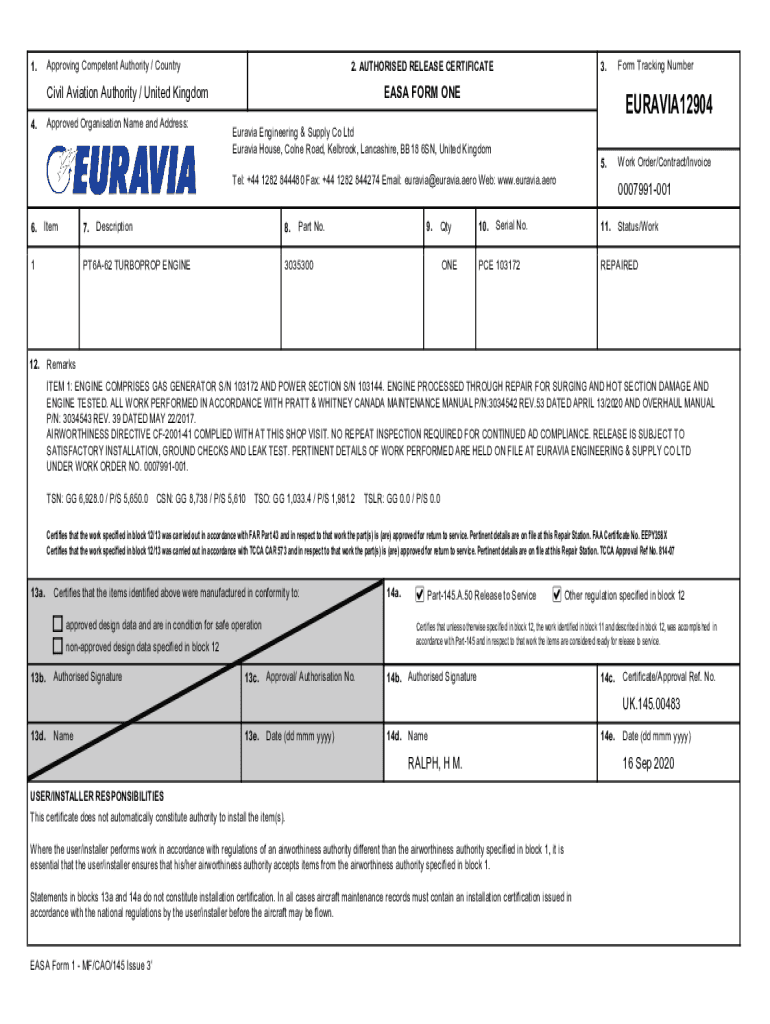 1. Approving Competent Authority / Country2. Authorized RELEASE CERTIFICATECivil Aviation Authority / United Kingdom 4. Approved Organization Name and Address:3.EASA FORM ONEEURAVIA12904Euravia Engineering