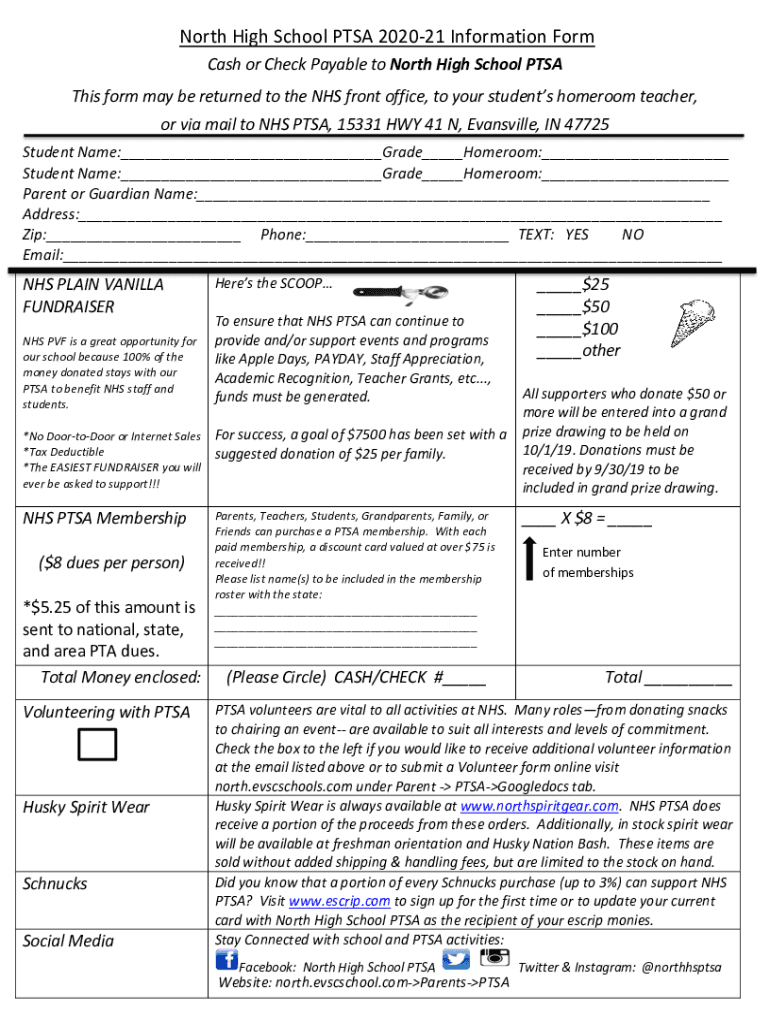 North High School PSA 202021 Information Form Cash or Check Payable to North High School PSA This form may be returned to the NHS front office, to your students homeroom teacher, or via mail to NHS
