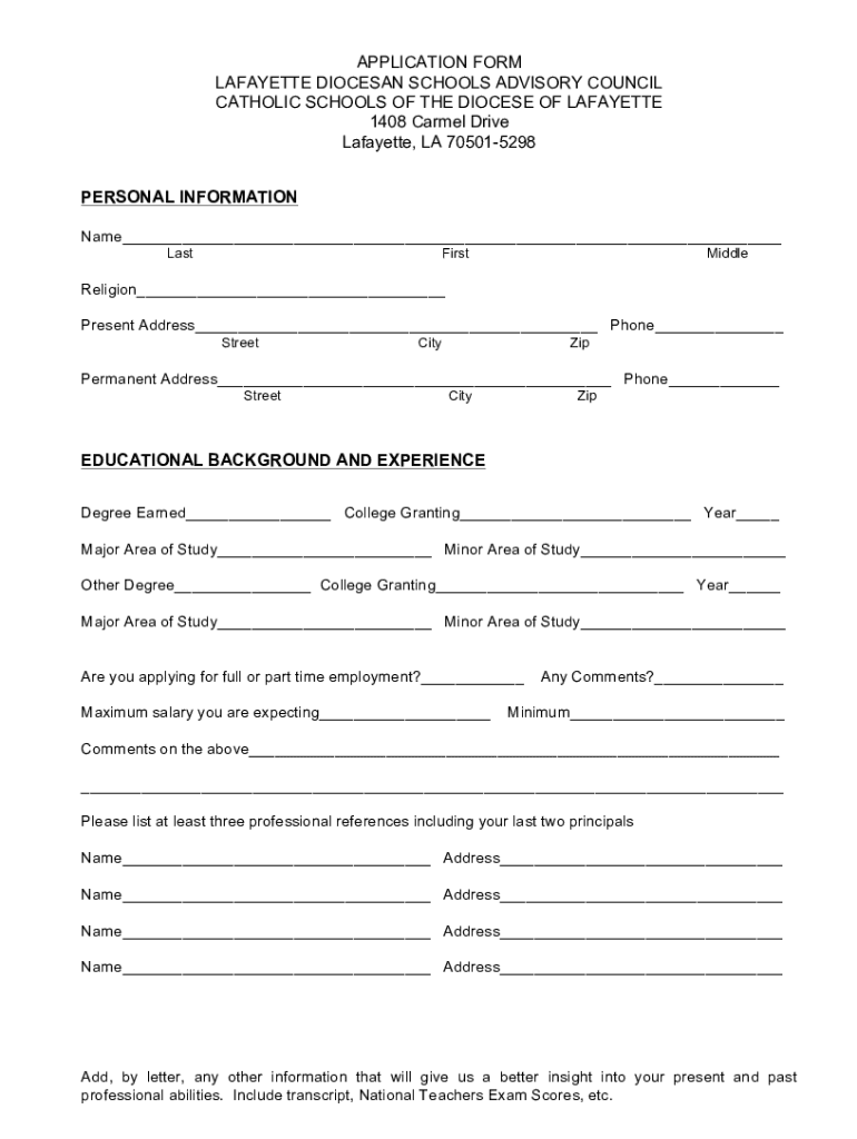 APPLICATION FORM LAFAYETTE DIOCESAN SCHOOLS ADVISORY COUNCIL CATHOLIC SCHOOLS OF THE DIOCESE OF LAFAYETTE 1408 Carmel Drive Lafayette, LA 705015298 PERSONAL INFORMATION Name LastFirstMiddleReligion