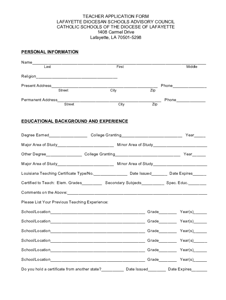 TEACHER APPLICATION FORM LAFAYETTE DIOCESAN SCHOOLS ADVISORY COUNCIL CATHOLIC SCHOOLS OF THE DIOCESE OF LAFAYETTE 1408 Carmel Drive Lafayette, LA 705015298 PERSONAL INFORMATION Name LastFirstMiddleReligion