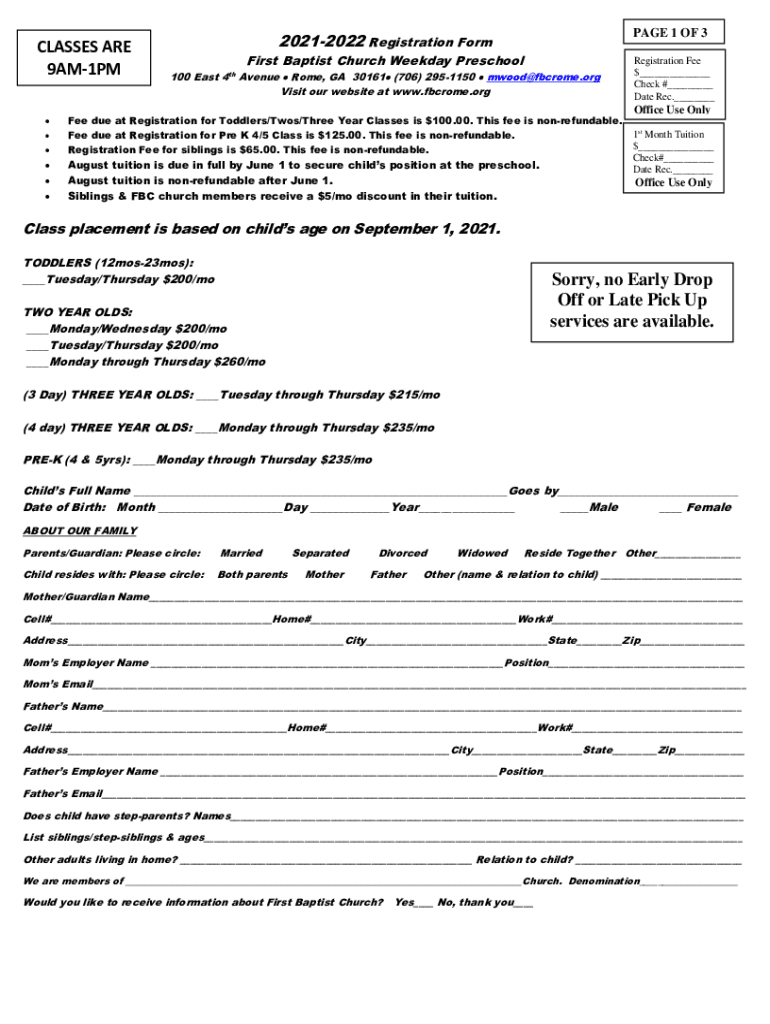 CLASSES ARE 9AM1PMPAGE 1 OF 320212022 Registration Form First Baptist Church Weekday Preschool 100 East 4th Avenue Rome, GA 30161 (706) 2951150 mwood@fbcrome.org Visit our website at www.fbcrome.orgFee