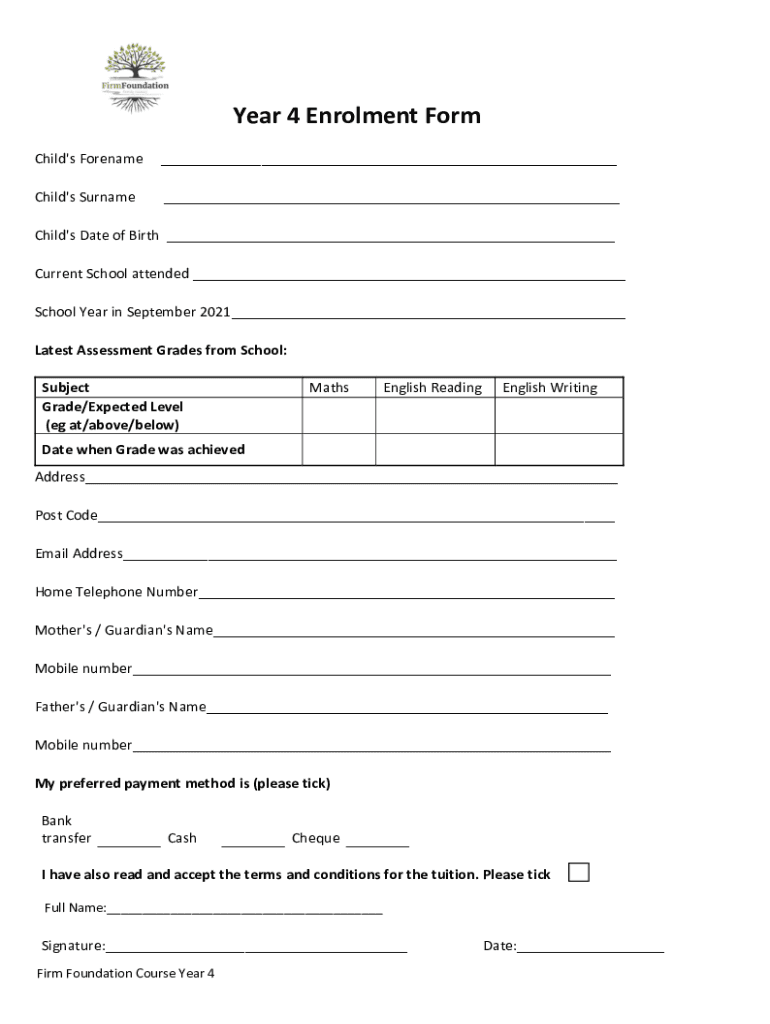 Year 4 Enrollment Form Child's Forename Child's Surname Child's Date of Birth Current School attended School Year in September 2021 The Latest Assessment Grades from School: Subject Grade/Expected