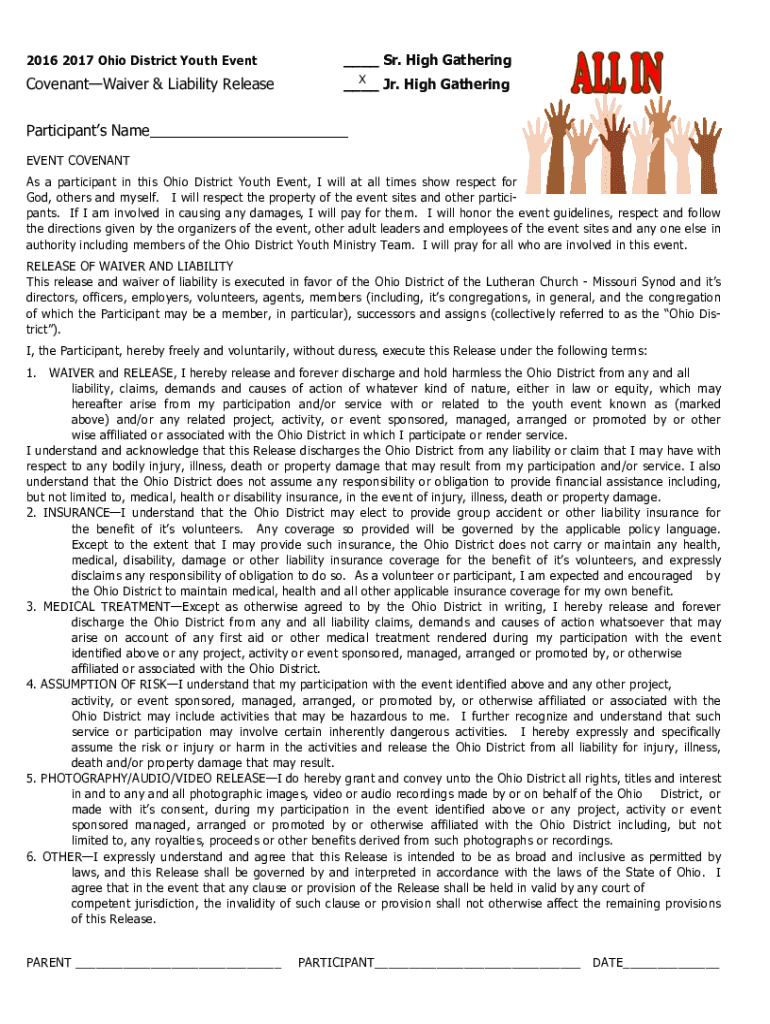 2016 2017 Ohio District Youth Event Sr. High GatheringCovenantWaiver & Liability Released Jr. High Gathering Participants Name EVENT COVENANT As a participant in this Ohio District Youth Event, I