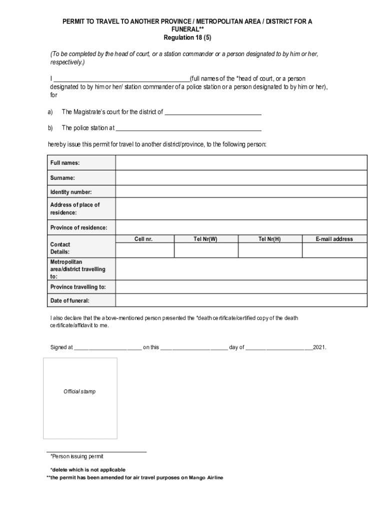 PERMIT Traveling TO ANOTHER PROVINCE / METROPOLITAN AREA / DISTRICT FOR A FUNERAL** Regulation 18 (5) (To be completed by the head of court, or a station commander or a person designated to by him
