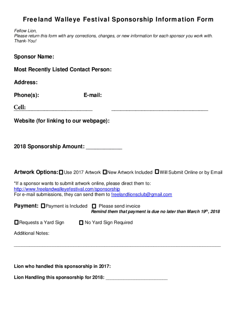 Freeland Walleye Festival Sponsorship Information Form Fellow Lion, Please return this form with any corrections, changes, or new information for each sponsor you work with. Thank-you! Sponsor Name: