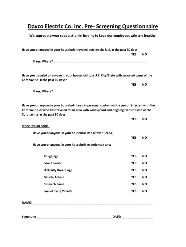 Davao Electric Co. Inc. PRE Screening Questionnaire We appreciate your cooperation in helping to keep our employees safe and healthy. Have you or anyone in your household traveled outside the U.S.