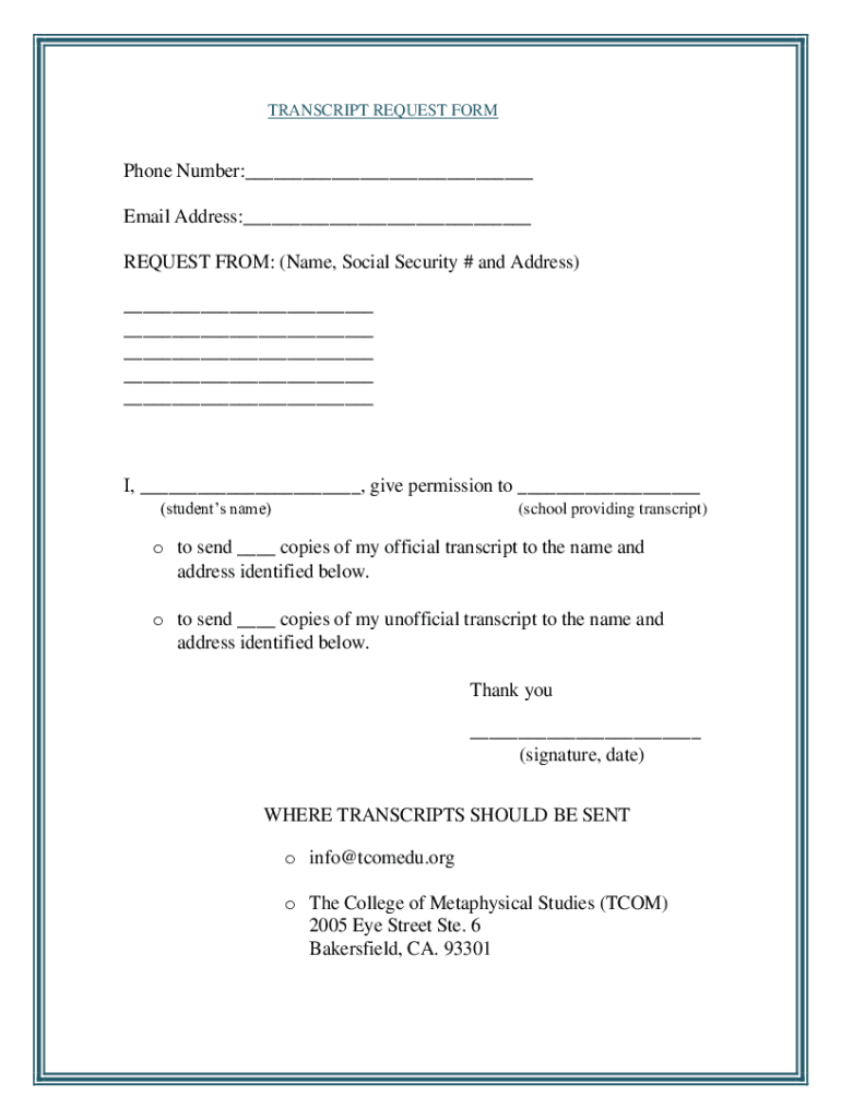 TRANSCRIPT REQUEST Hormone Number: Email Address: REQUEST FROM: (Name, Social Security # and Address) I, give permission to (students name)(school providing transcript)o to send copies of my official
