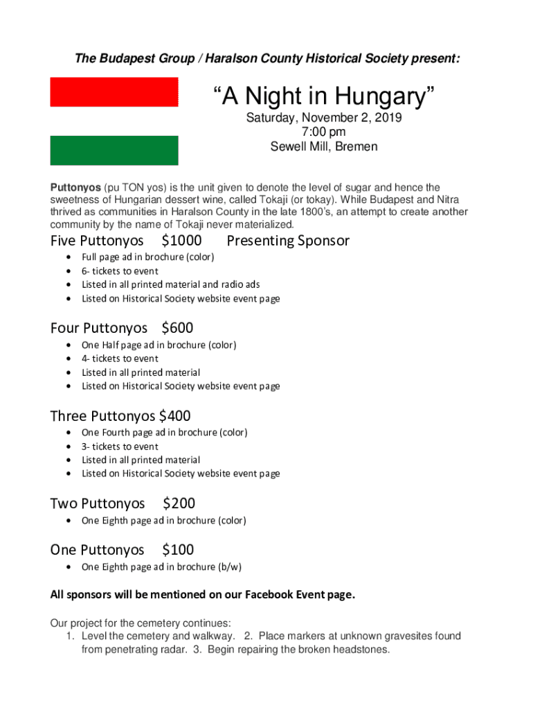 The Budapest Group / Harrison County Historical Society present:A Night in Hungary Saturday, November 2, 2019 7:00 pm Sewell Mill, Bremen Buttons (PU TON you) is the unit given to denote the level