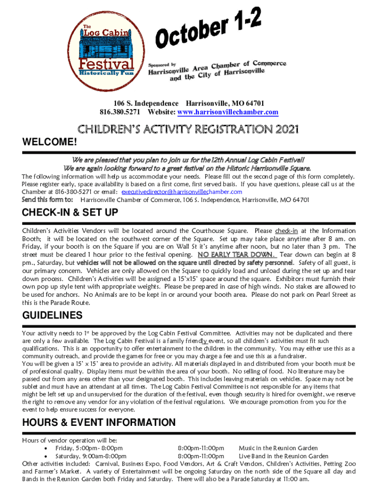 106 S. Independence Harrisonville, MO 64701 816.380.5271 Website: www.harrisonvillechamber.comCHILDRENS ACTIVITY REGISTRATION 2021 WELCOME! We are pleased that you plan to join us for the 12th Annual