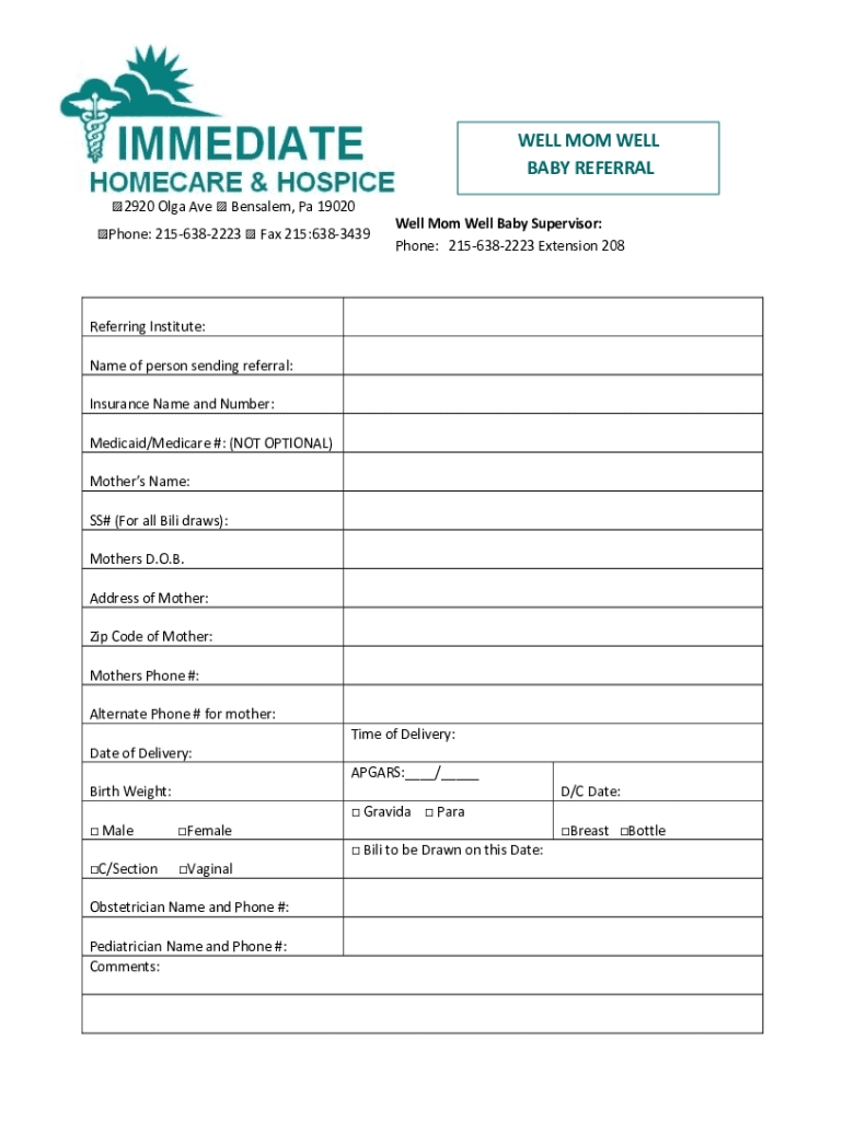 WELL MOM WELL BABY REFERRAL 2920 Olga Ave Bensalem, Pa 19020 Phone: 2156382223 Fax 215:6383439Well Mom Well Baby Supervisor: Phone: 2156382223 Extension 208Referring Institute: Name of person sending