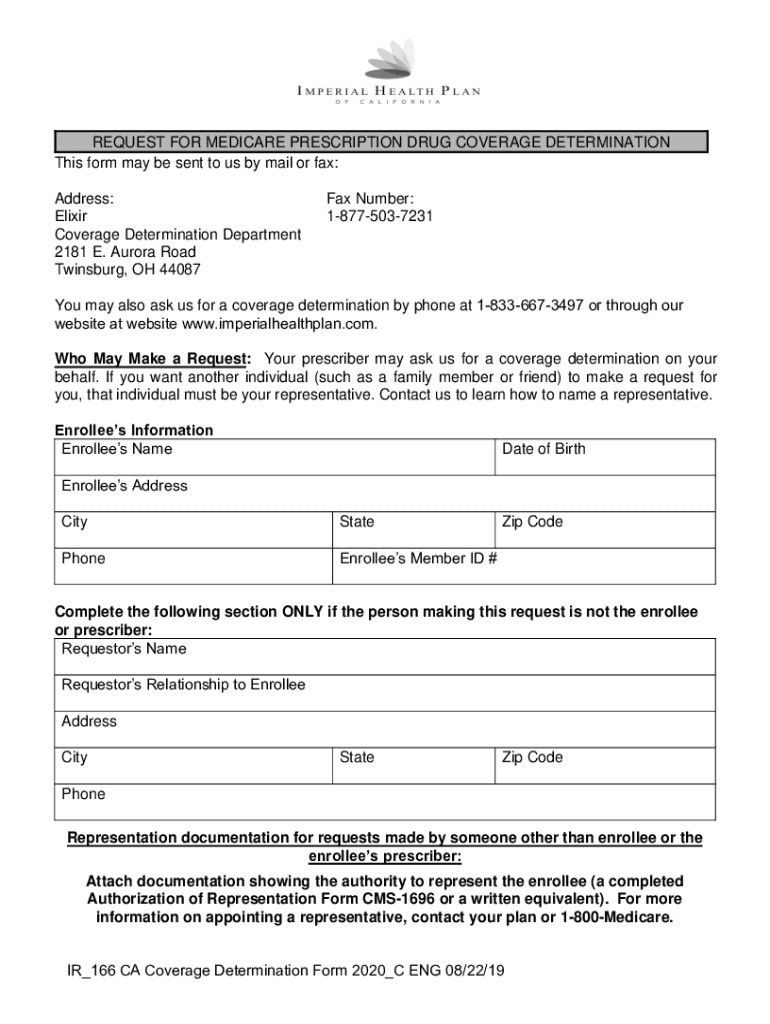 Get the free REQUEST FOR MEDICARE PRESCRIPTION DRUG COVERAGE DETERMINATION - Imperial Health Plan