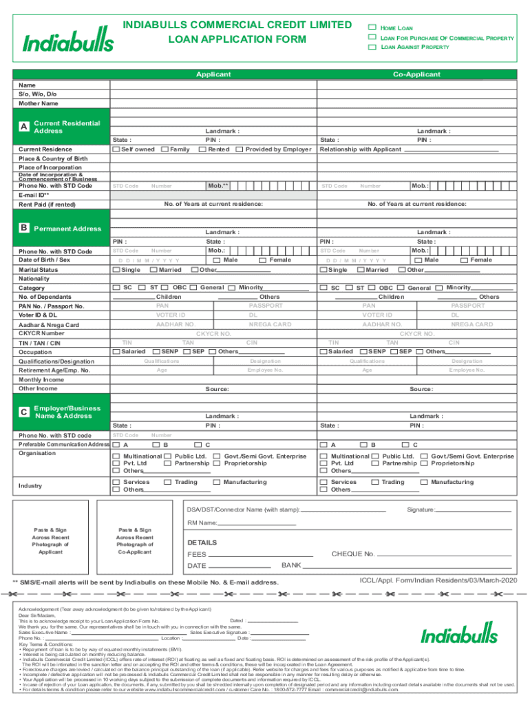 INDIABULLS COMMERCIAL CREDIT LIMITED LOAN APPLICATION WORMHOLE LOAN FOR PURCHASE OF COMMERCIAL PROPERTY LOAN AGAINST PROPERTYApplicantCoApplicantName S/o, W/o, D/o Mother NameACurrent Residential