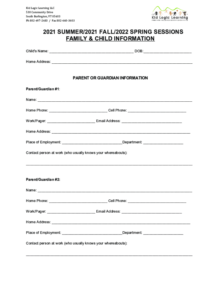 Kid Logic Learning LLC 530 Community Drive South Burlington, VT 05403 pH 8024972483 / Fax 80266036032021 SUMMER/2021 FALL/2022 SPRING SESSIONS FAMILY & CHILD INFORMATION Child's Name: DOB: Home Address: