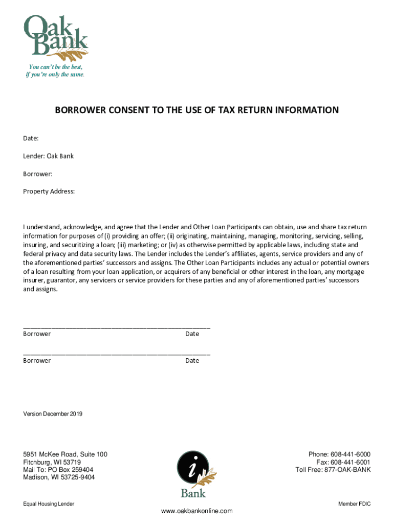 You can't be the best, if you're only the same. BORROWER CONSENT TO THE USE OF TAX RETURN INFORMATION Date: Lender: Oak Bank Borrower: Property Address:I understand, acknowledge, and agree that the