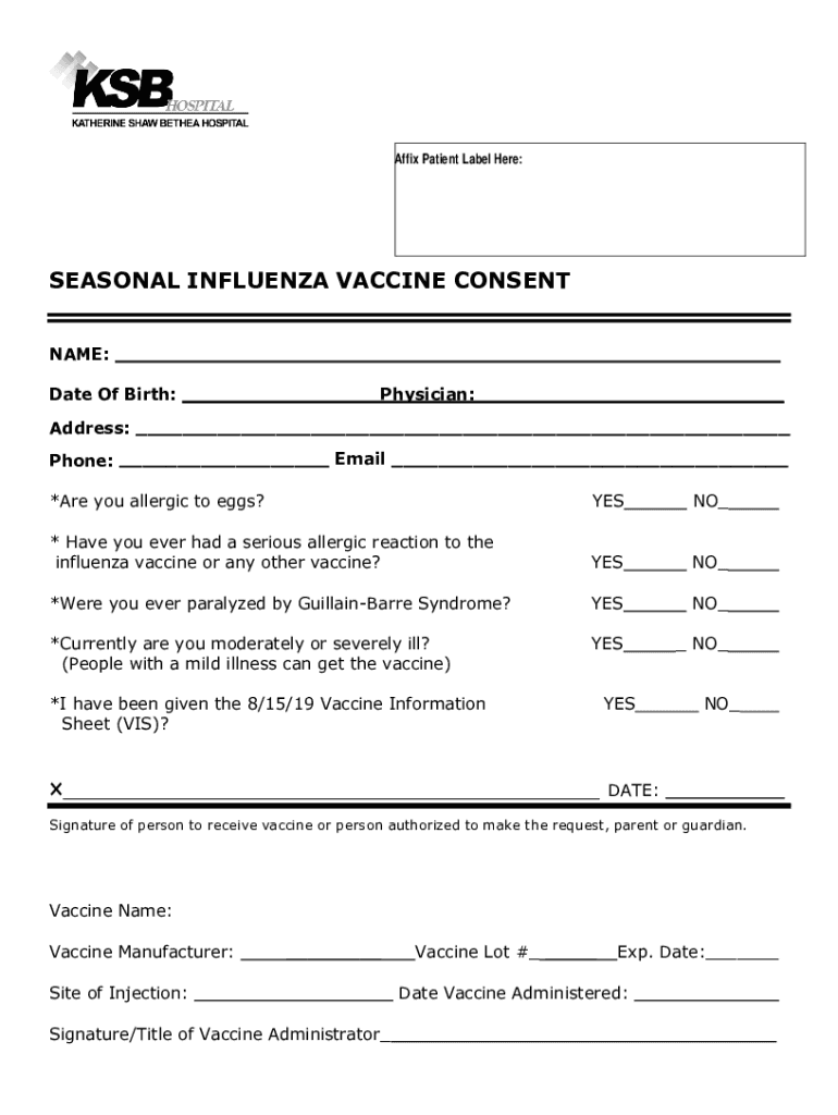 Affix Patient Label Here:SEASONAL INFLUENZA VACCINE CONSENT NAME: Date Of Birth: Physician: Address: Phone: Email *Are you allergic to eggs?YES NO * Have you ever had a serious allergic reaction to