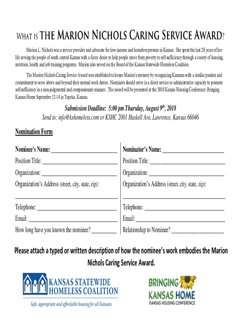 Marion L. Nichols was a service provider and advocate for low income and homeless persons in Kansas. She spent the last 28 years of her life serving the people of south central Kansas with a fierce