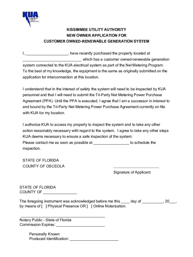 KISSIMMEE UTILITY AUTHORITY NEW OWNER APPLICATION FOR CUSTOMER OWNEDRENEWABLE GENERATION SYSTEM I, have recently purchased the property located at which has a customer owned renewable generation system