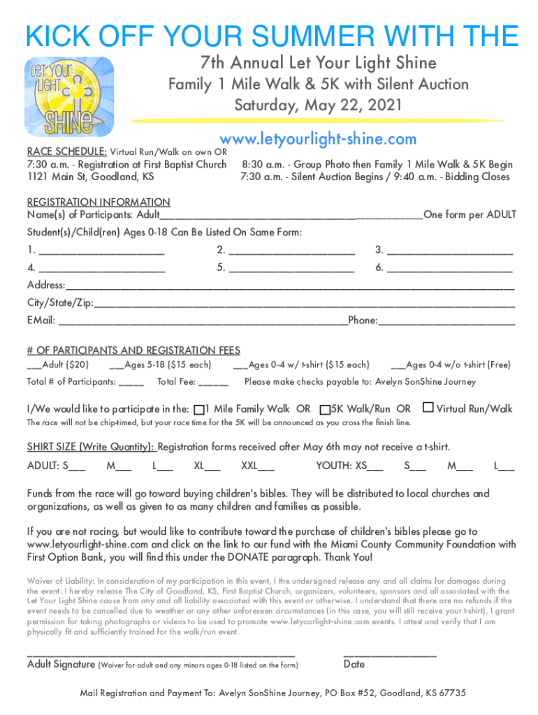 KICK OFF YOUR SUMMER WITH THE 7th Annual Let Your Light ShineFamily 1-Mile Walk & 5K with Silent Auction Saturday, May 22, 2021www.letyourlightshine.comrade SCHEDULE: Virtual Run/Walk on own OR 7:30