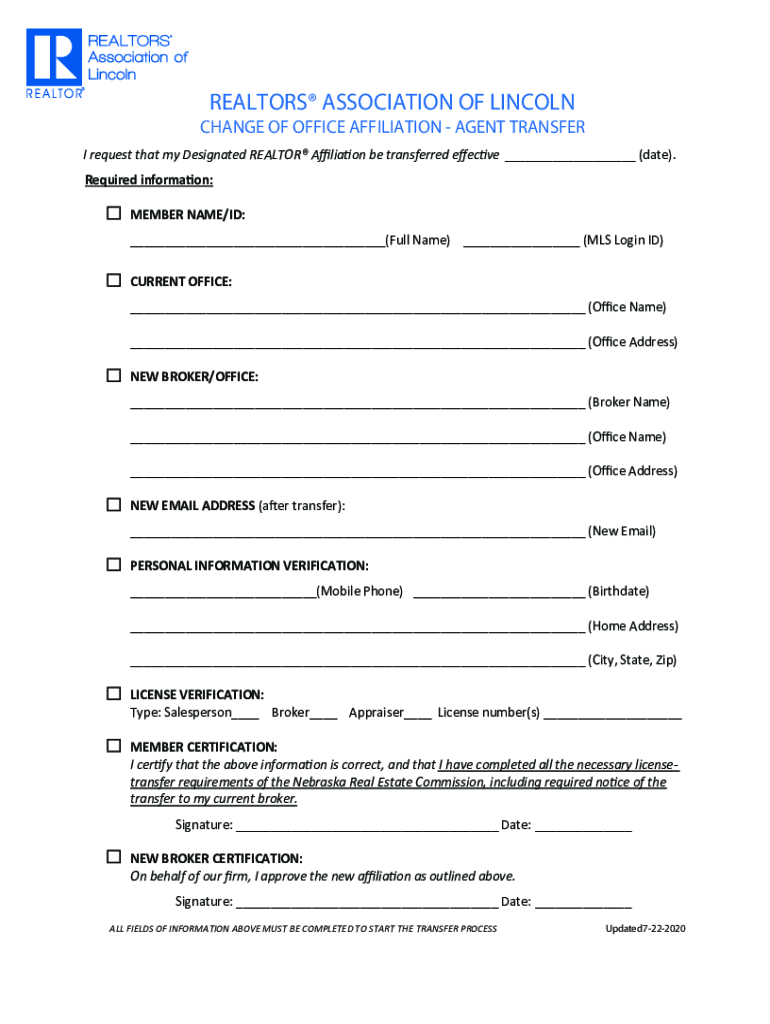 REALTORS ASSOCIATION OF LINCOLN CHANGE OF OFFICE AFFILIATION AGENT TRANSFER I request that my Designated REALTOR Aviation be transferred elective (date). Required information: MEMBER NAME/ID: (Full
