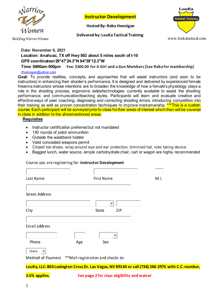 Instructor Development Hosted By: Reba Hannigan Building Warrior WomenDelivered by: Luka Tactical Training.loukatactical.combat: November 6, 2021, Location: Annual, TX off Hwy 563 about 5 miles south