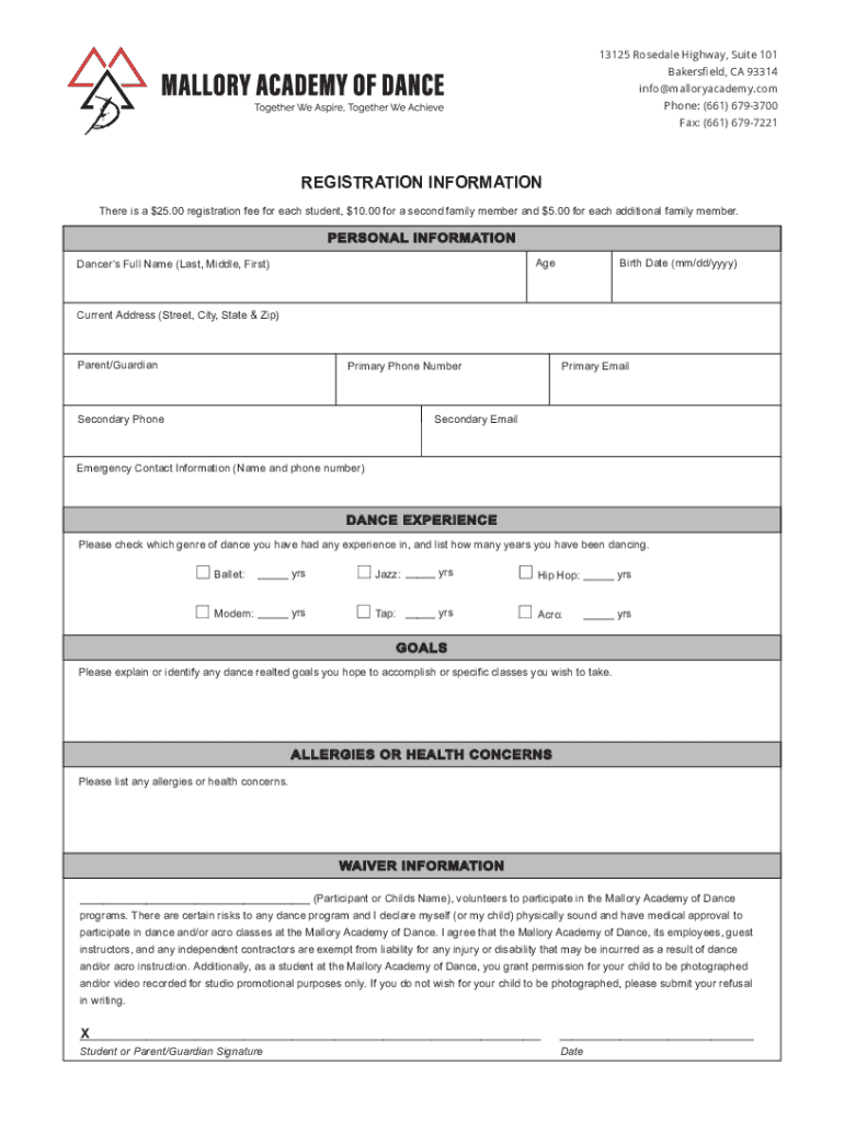 13125 Rose dale Highway, Suite 101 Bakersfield, CA 93314 info malloryacademy.com Phone: (661) 6793700 Fax: (661) 6797221REGISTRATION INFORMATION There is a $25.00 registration fee for each student,
