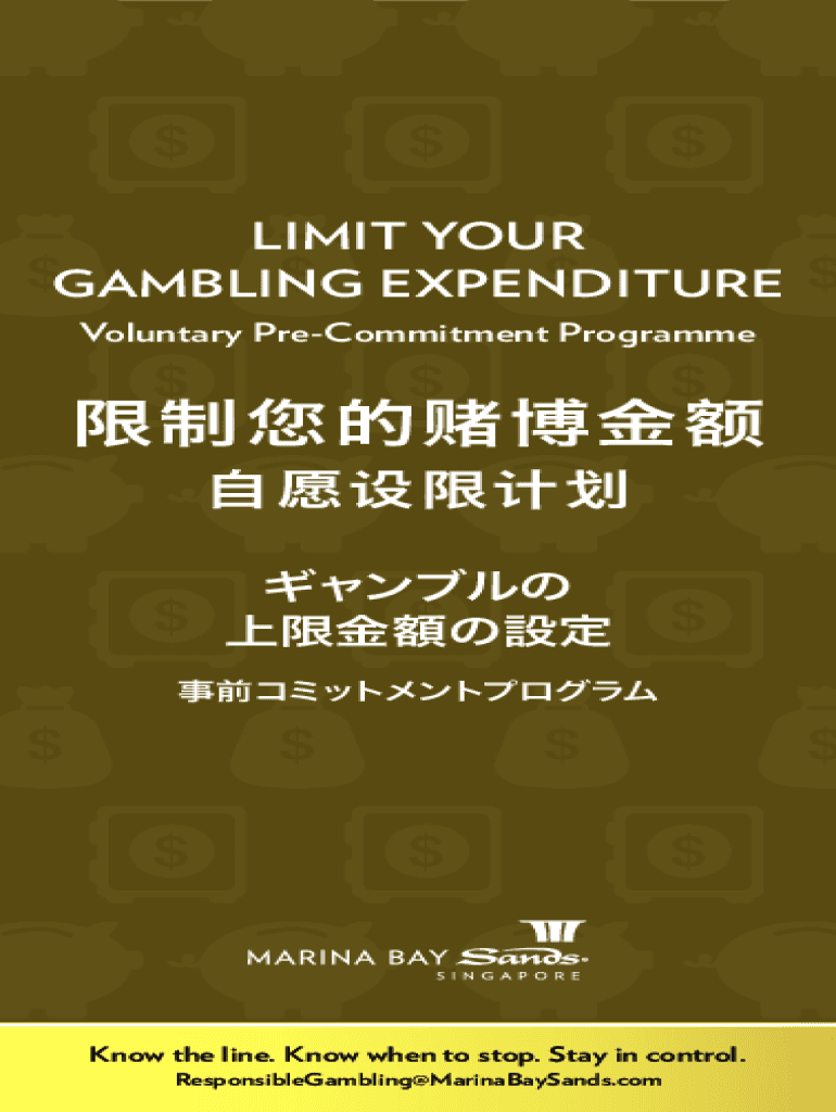 LIMIT YOUR GAMBLING EXPENDITURE Voluntary Commitment Program Know the line. Know when to stop. Stay in control. ResponsibleGambling@MarinaBaySands.comCOMMITMENT TO OUR PATRONS At Marina Bay Sands,