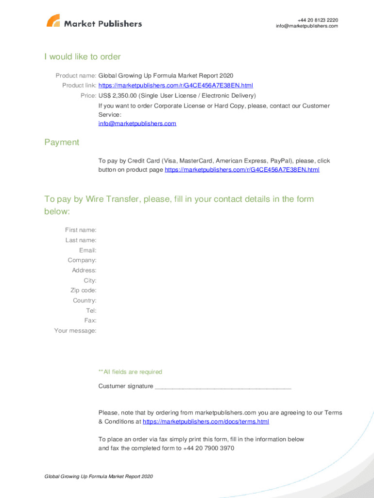 +44 20 8123 2220 info@marketpublishers.comGlobal Growing Up Formula Market Report 2020 https://marketpublishers.com/r/G4CE456A7E38EN.html Date: May 2020 Pages: 115 Price: US$ 2,350.00 (Single User