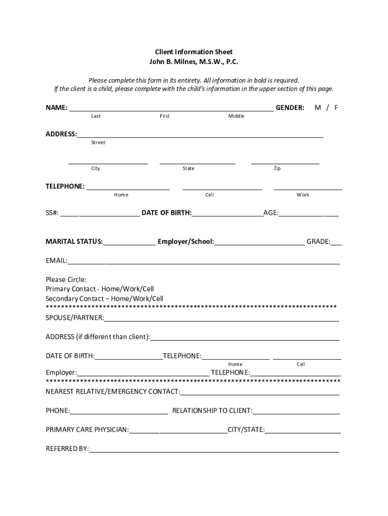 Client Information Sheet John B. Milne's, M.S.W., P.C. Please complete this form in its entirety. All information in bold is required. If the client is a child, please complete with the children information