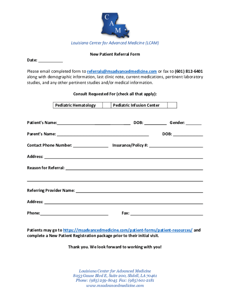 Louisiana Center for Advanced Medicine (CAM) New Patient Referral Form Date: Please email completed form to referrals msadvancedmedicine.com or fax to (601) 8126401 along with demographic information,