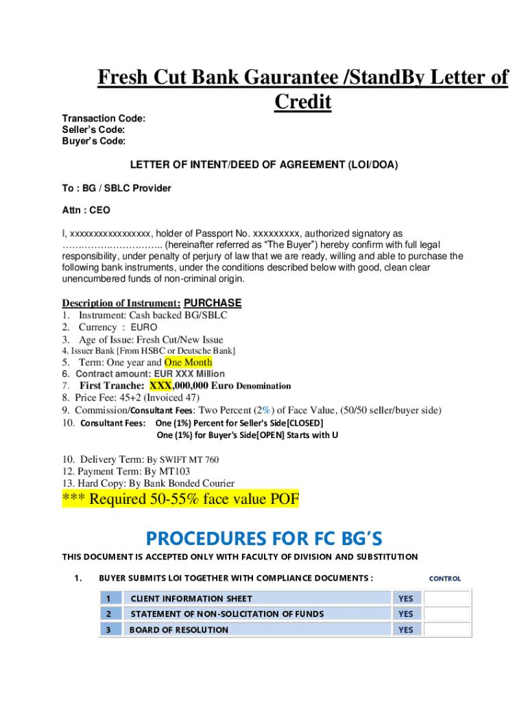 Fresh Cut Bank Guarantee /Standby Letter of Credit Transaction Code: Sellers Code: Buyers Code:LETTER OF INTENT/DEED OF AGREEMENT (LOI/DOA) To : BG / SBLC Provider Attn : CEO I, xxxxxxxxxxxxxxxxx,