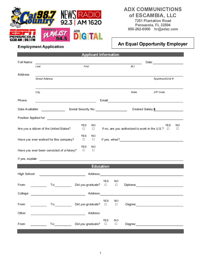 ADX COMMUNICATIONS of ZAMBIA, LLC 7251 Plantation Road Pensacola, FL 32504 8502626000 hr@adxc.comAn Equal Opportunity EmployerEmployment ApplicationApplicant Information Full Name:Date: LastFirstM.