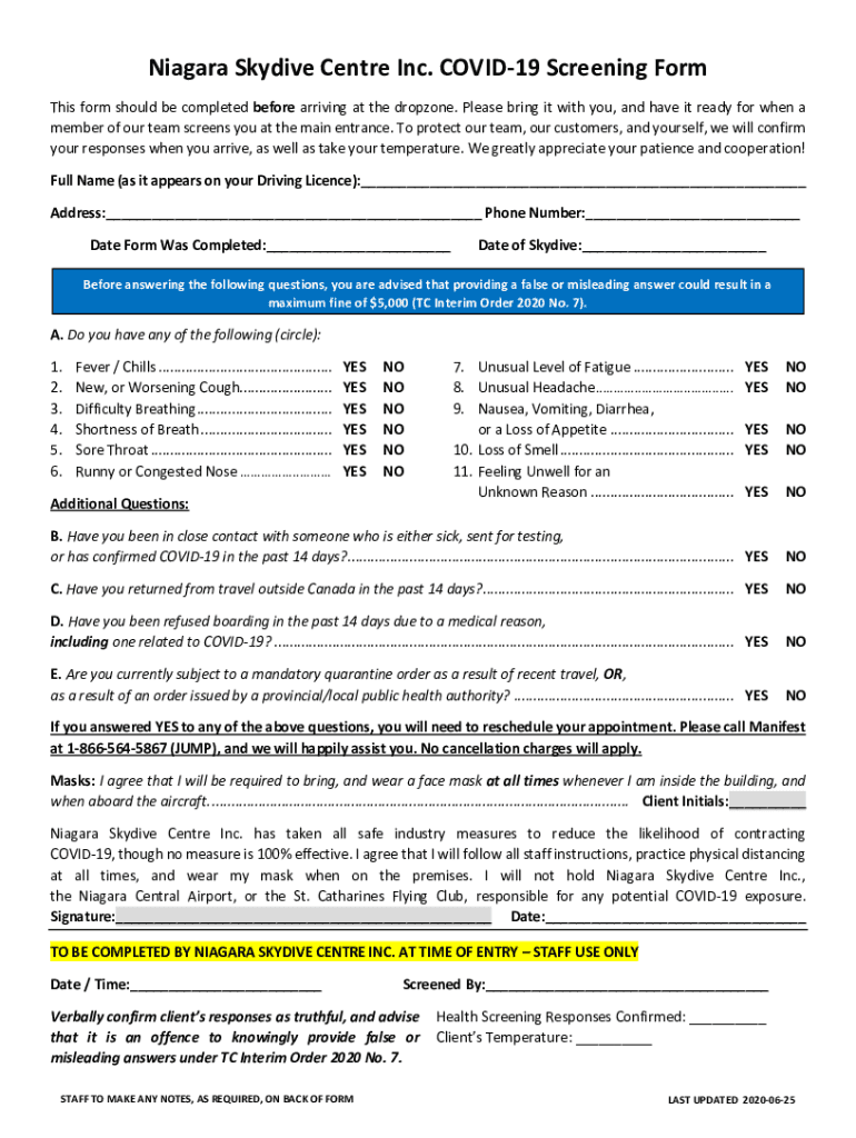 Niagara Skydive Center Inc. COVID-19 Screening Form This form should be completed before arriving at the drop zone. Please bring it with you, and have it ready for when a member of our team screens
