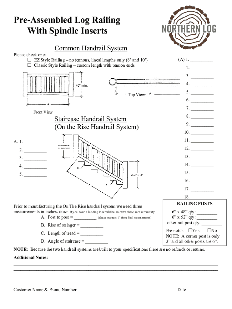 PreAssembled Log Railing With Spindle Inserts Common Handrail System Please check one: EZ Style Railing no tendons, lineal lengths only (8 and 10) Classic Style Railing custom length with Lennon ends(A)