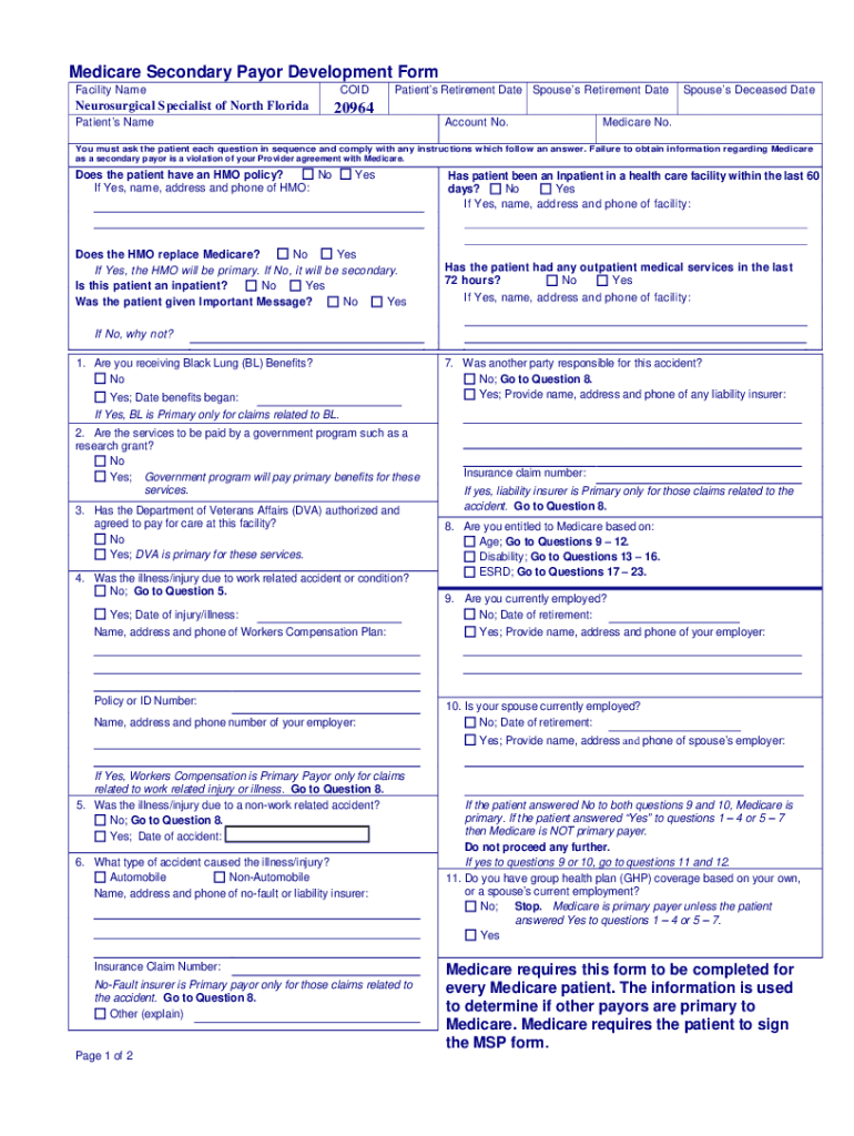 Medicare Secondary Mayor Development Form Facility NameNeurosurgical Specialist of North FloridaCOIDPatients Retirement Date Spouses Retirement Espouses Deceased Date20964Patients NameAccount No.
