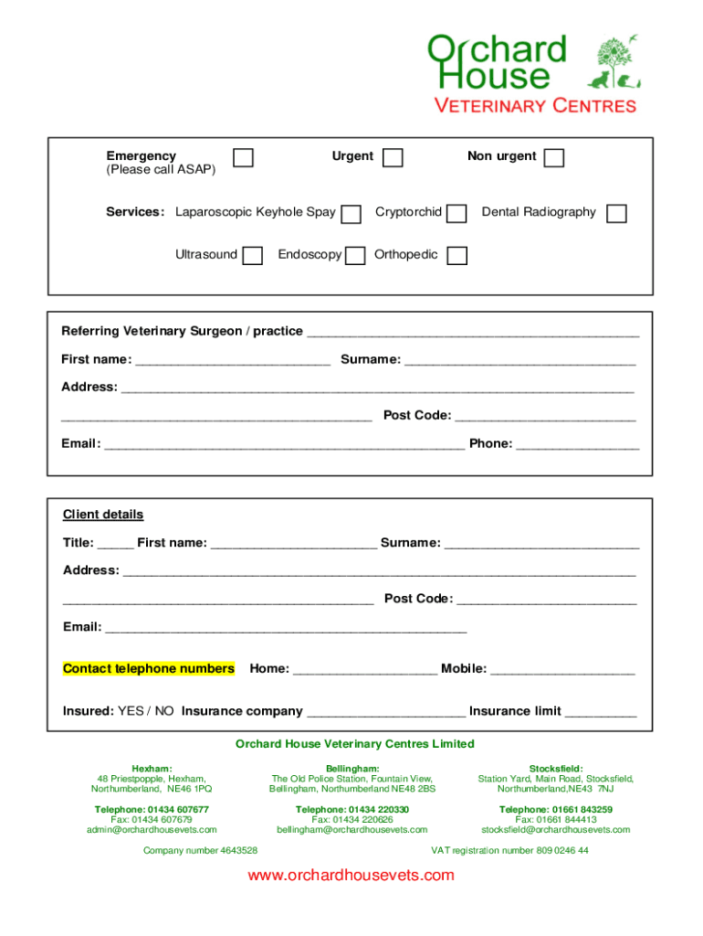 Emergency (Please call ASAP)UrgentServices: Laparoscopic Keyhole SpayUltrasoundEndoscopyNon urgentCryptorchidDental RadiographyOrthopedicReferring Veterinary Surgeon / practice First name: Surname:
