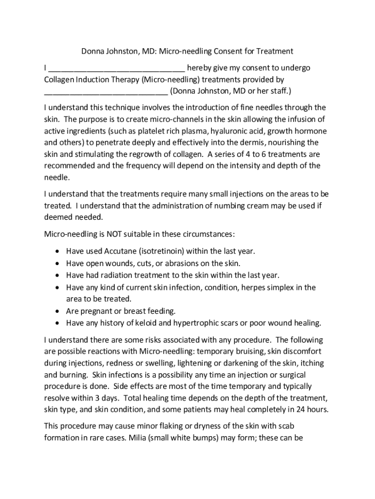 Get the free Donna Johnston, MD: Micro-needling Consent for Treatment ...