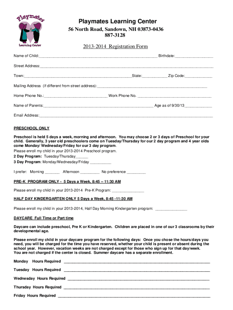 Playmates Learning Center 56 North Road, Sundown, NH 038730436 8873128 20132014 Registration Form Name of Child: Birthdate: Street Address: Town: State: Zip Code: Mailing Address (if different from