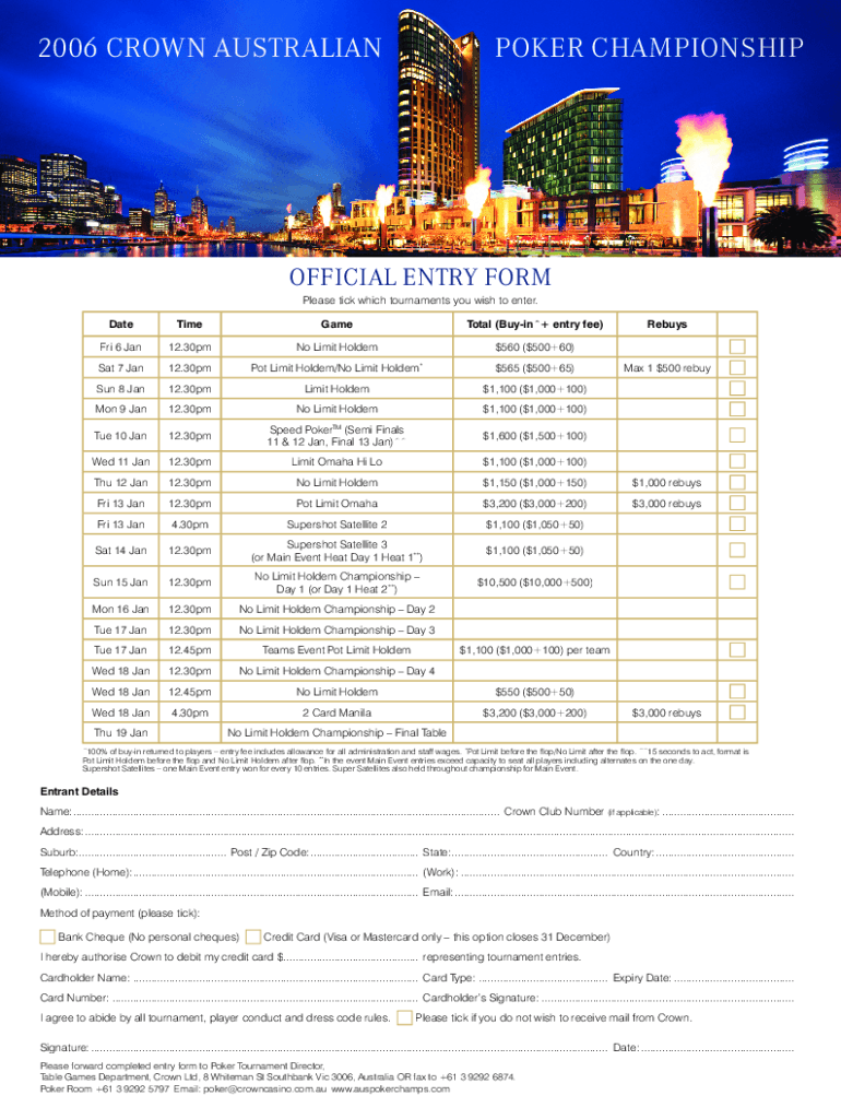2006 CROWN AUSTRALIANPOKER CHAMPIONSHIPOFFICIAL ENTRY FORM Please tick which tournaments you wish to enter. DateTimeGameTotal (Buying + entry fee)Fri 6 Jan12.30pmNo Limit Holdem$560 ($500+60)Sat 7