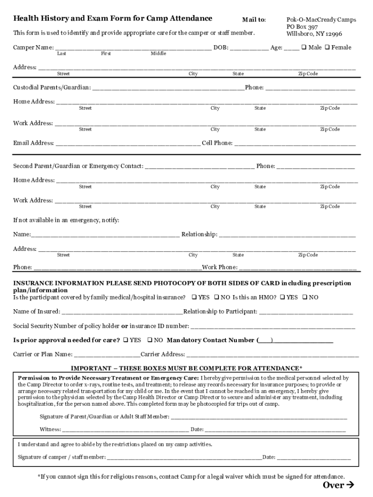 Health History and Exam Form for Camp AttendanceMail to:This form is used to identify and provide appropriate care for the camper or staff member. PokOMacCready Camps PO Box 397 Hillsboro, NY 12996Camper