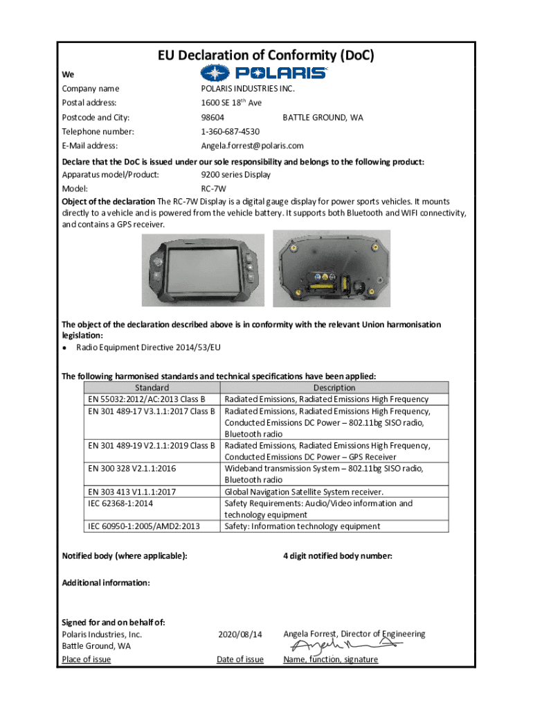 EU Declaration of Conformity (Doc) We Company nameplates INDUSTRIES INC. Postal address:1600 SE 18th Postcode and City:98604Telephone number:13606874530EMail address:Angela.forrest@polaris.comBATTLE