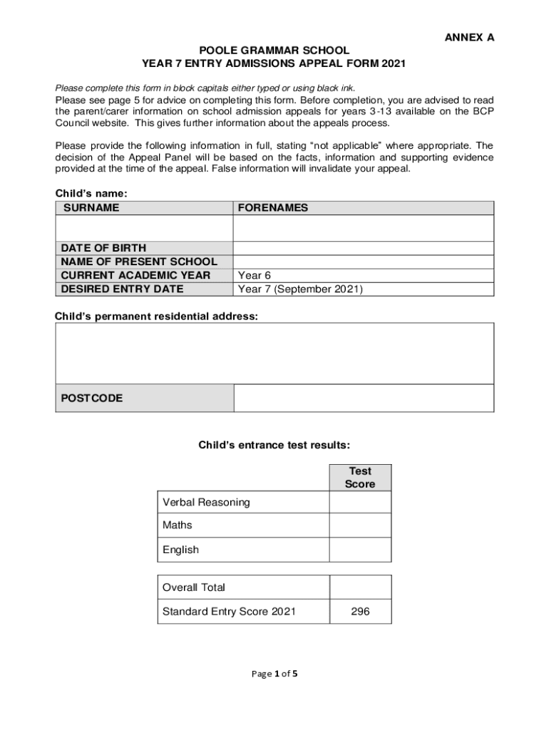 ANNEX A POOLE GRAMMAR SCHOOL YEAR 7 ENTRY ADMISSIONS APPEAL FORM 2021 Please complete this form in block capitals either typed or using black ink. Please see page 5 for advice on completing this form.