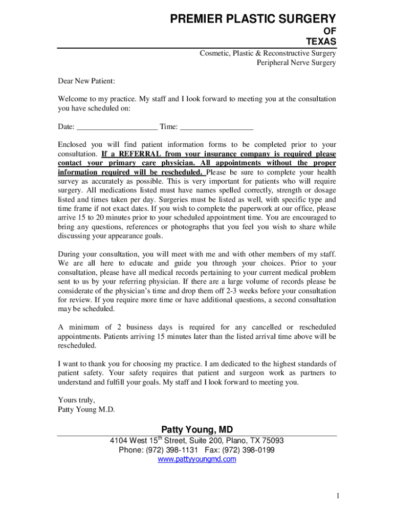 PREMIER PLASTIC SURGERY OF TEXAS Cosmetic, Plastic & Reconstructive Surgery Peripheral Nerve Surgery Dear New Patient: Welcome to my practice. My staff and I look forward to meeting you at the consultation