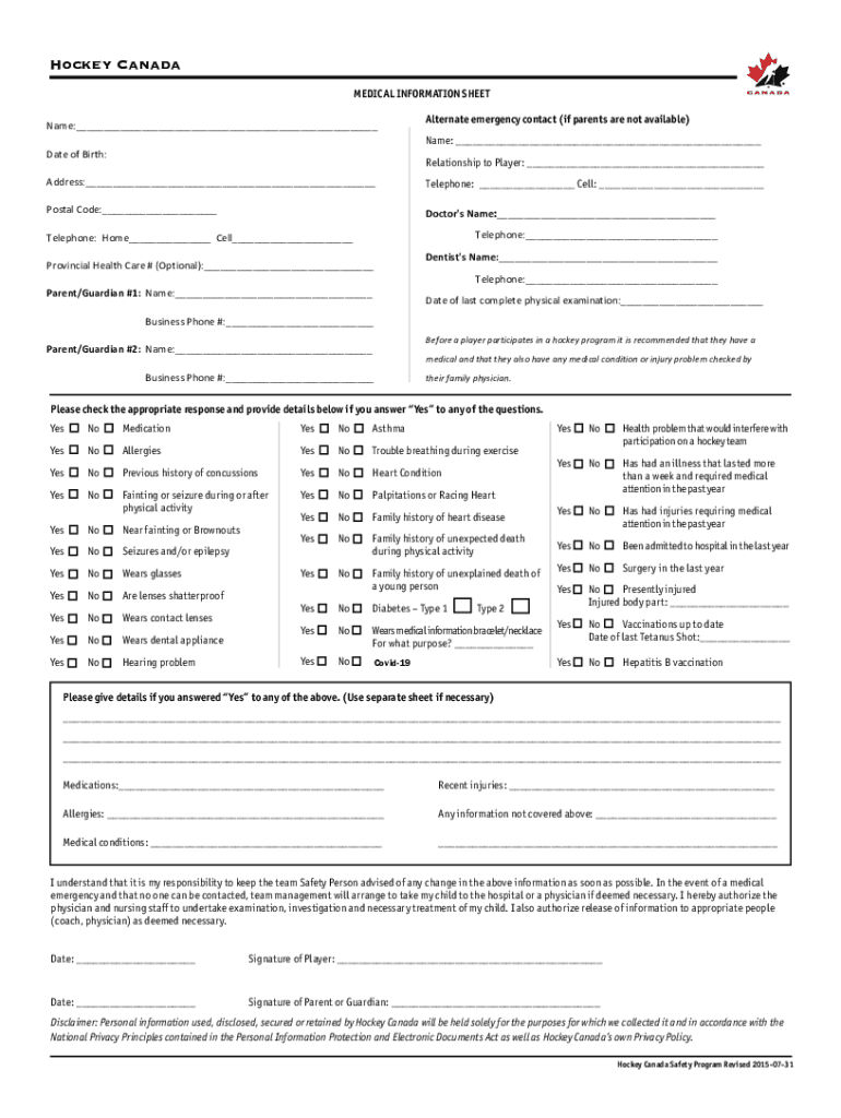 Hockey Canada MEDICAL INFORMATION SHEET Name: Alternate emergency contact (if parents are not available) Name: Date of Birth:Relationship to Player: Address: Telephone: Cell: Postal Code: Doctor's