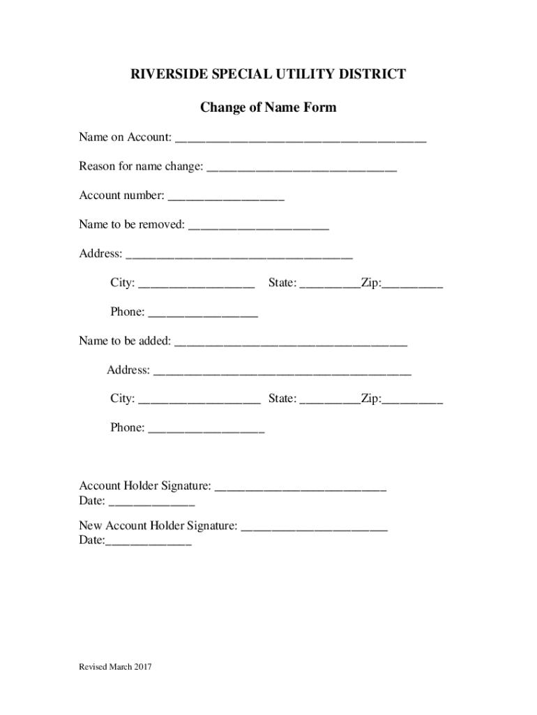 RIVERSIDE SPECIAL UTILITY DISTRICT Change of Name Form Name on Account: Reason for name change: Account number: Name to be removed: Address: City: State: Zip: Phone: Name to be added: Address: City: