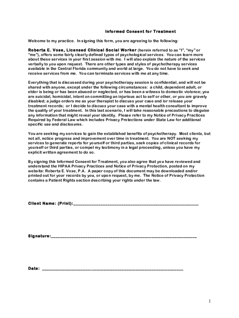 Informed Consent for Treatment Welcome to my practice. In signing this form, you are agreeing to the following: Roberta E. Vote, Licensed Clinical Social Worker (herein referred to as I, my or me),