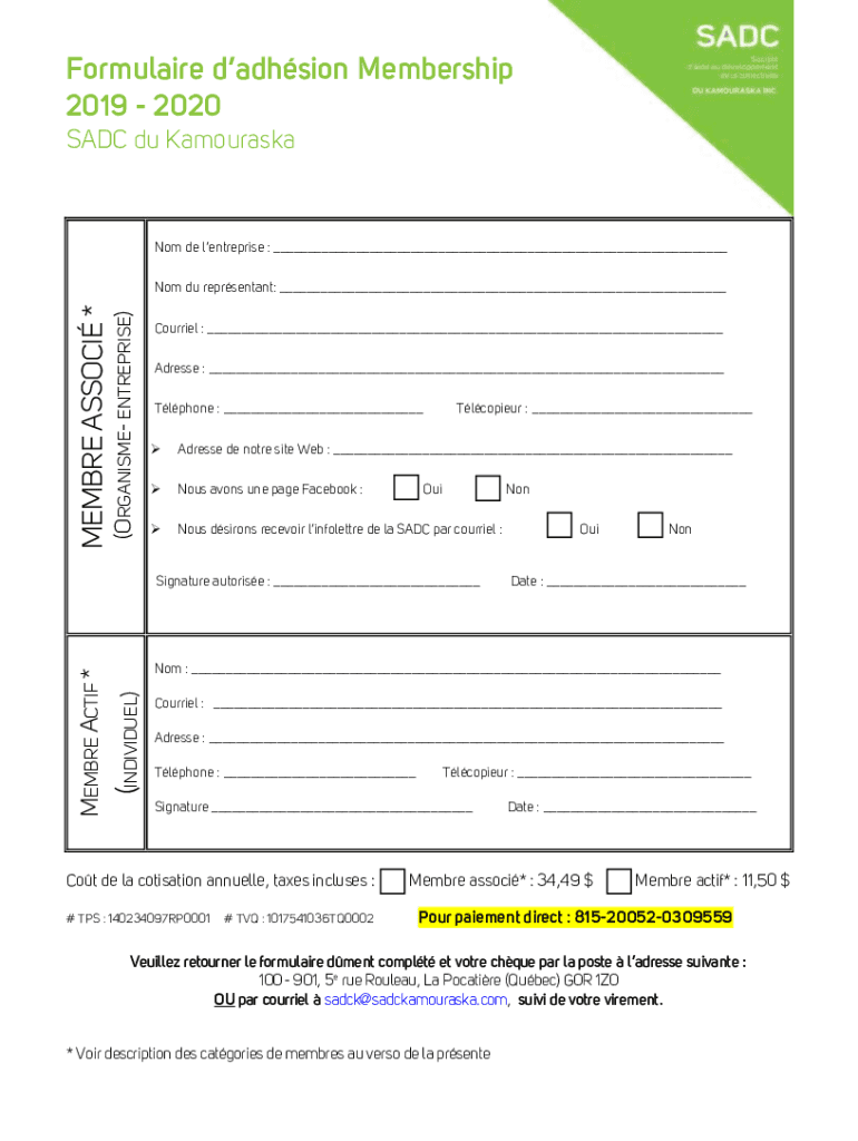 Formula ire adhesion Membership 2019 2020 SADC du KamouraskaNom de lent reprise : (ORGANISM ENTERPRISE)MEMBER ASSOC *Not Du repentant: Courier : Address : Tl phone : Copier : Address DE note site