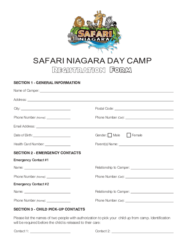 SAFARI NIAGARA DAY CAMP SECTION 1 GENERAL INFORMATION Name of Camper: Address: City:Postal Code:Phone Number (Home):Phone Number (Cell):Email Address: Date of Birth:Gender:Telehealth Card Number:Parent(s)