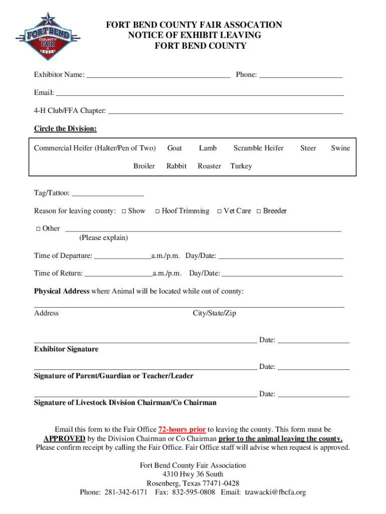 FORT BEND COUNTY FAIR ASSOCIATION NOTICE OF EXHIBIT LEAVING FORT BEND COUNTY Exhibitor Name: Phone: Email: 4H Club/FFA Chapter: Circle the Division: Commercial Heifer (Halter/Pen of Two) BroilerGoatLambScramble